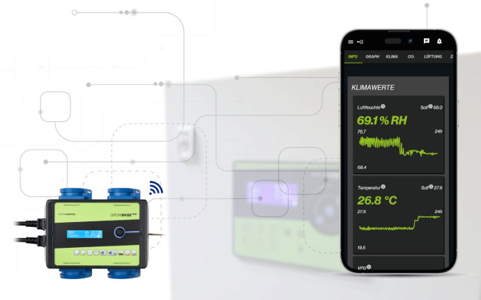 Mit GrowBase und GrowBase Pro kann der CO₂-Gehalt der Raumluft geregelt werden und so eine erhebliche Ertragssteigerung erzielt werden.
